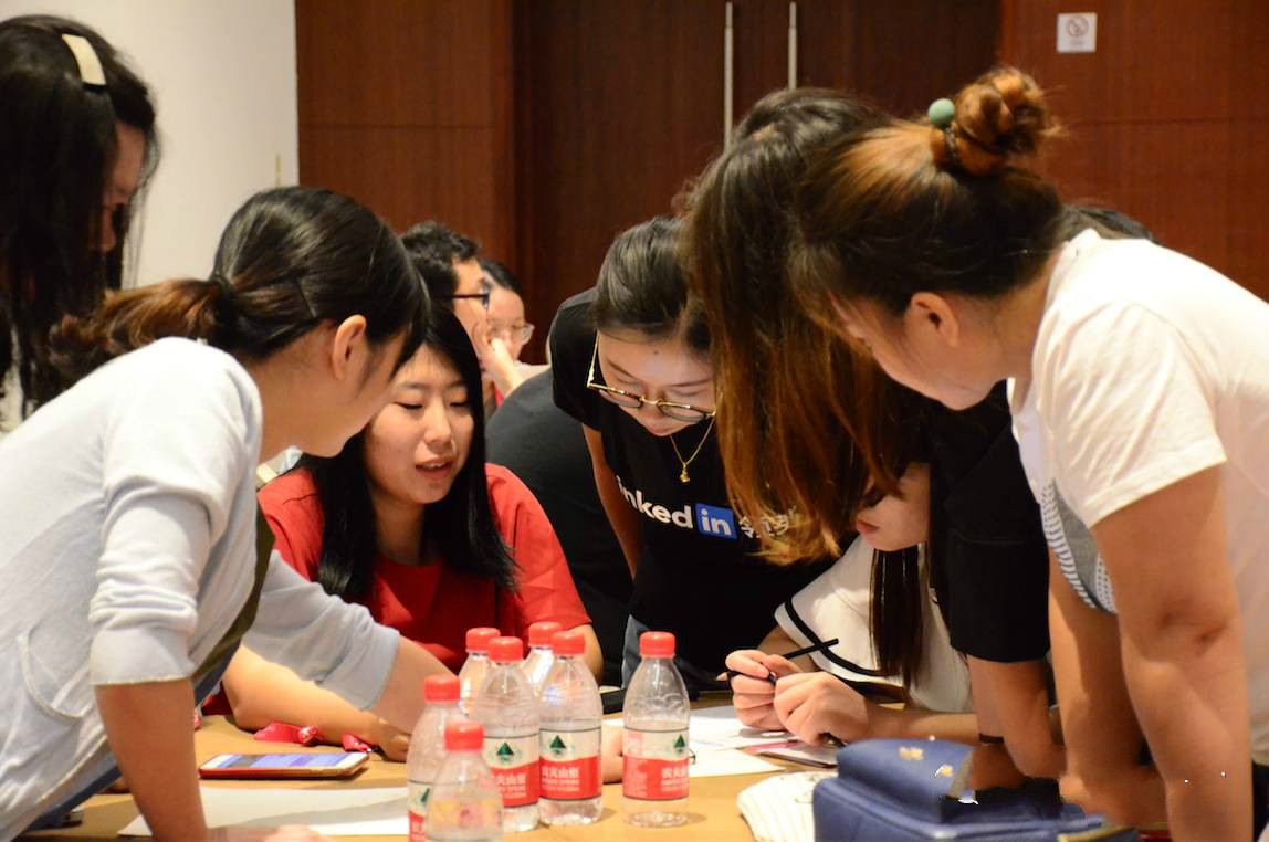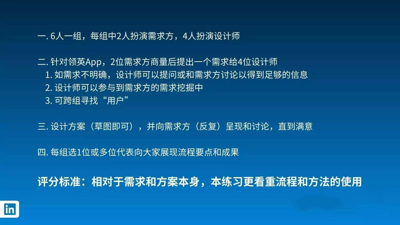 Cosplay时间到!我们把现场的小伙伴按照6人分为一组,2人扮演需求方,4人扮演设计师。针对领英App,2位需求方商量后提出一个需求给4位设计师: