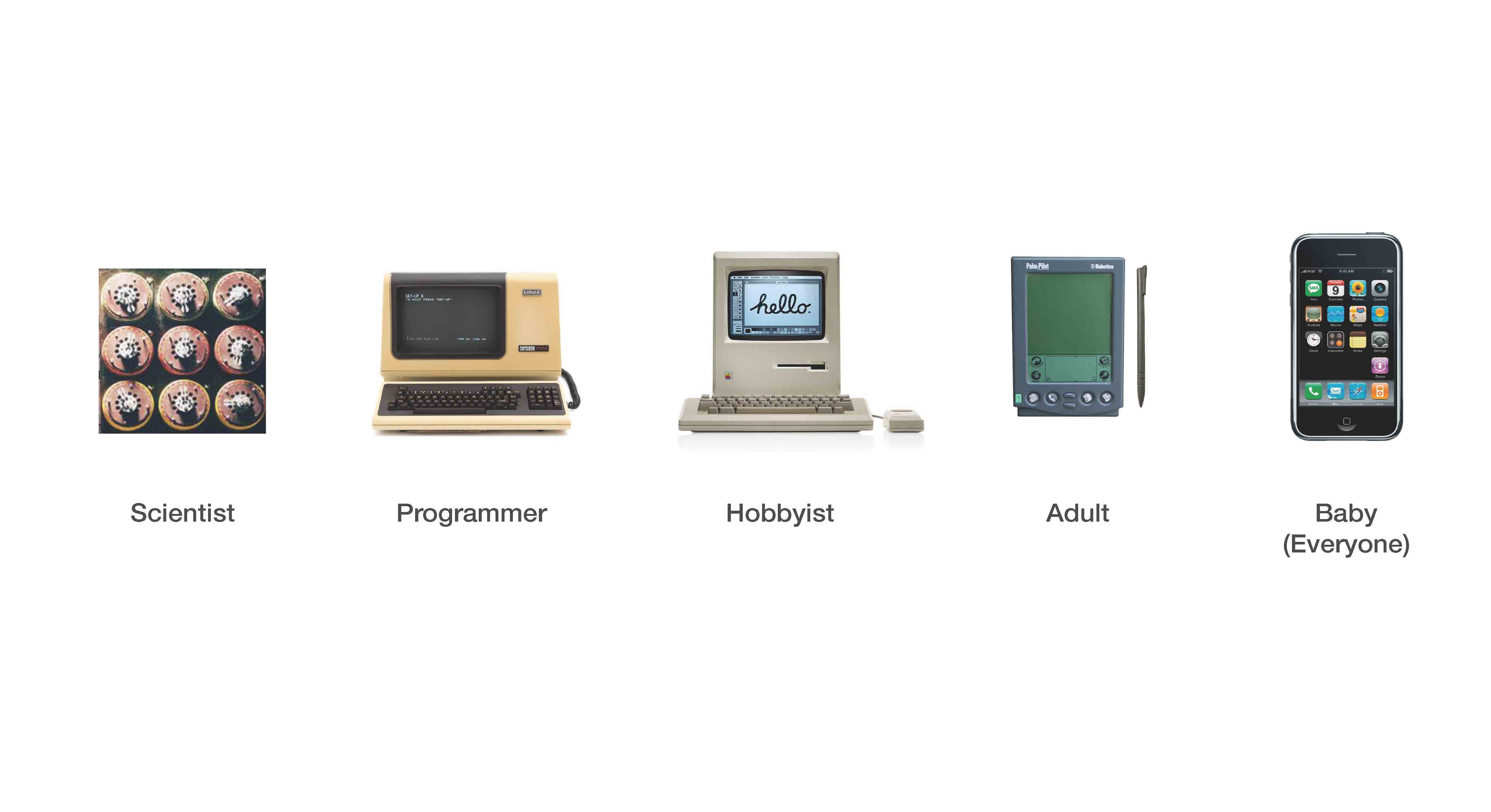 大家如果看交互设计的历史,会发现一个什么样的规律,会看到计算机从世界上只有少数几个人可以使用,再到专业的编程人员,再到所有的大众,再到现在1岁、2岁的小孩儿,可能连话都不会说,但是他会自如地用iphone、Ipad,所以我们可以看到交互设计在往一个更加自然、更加接近于人本能的方向发展。