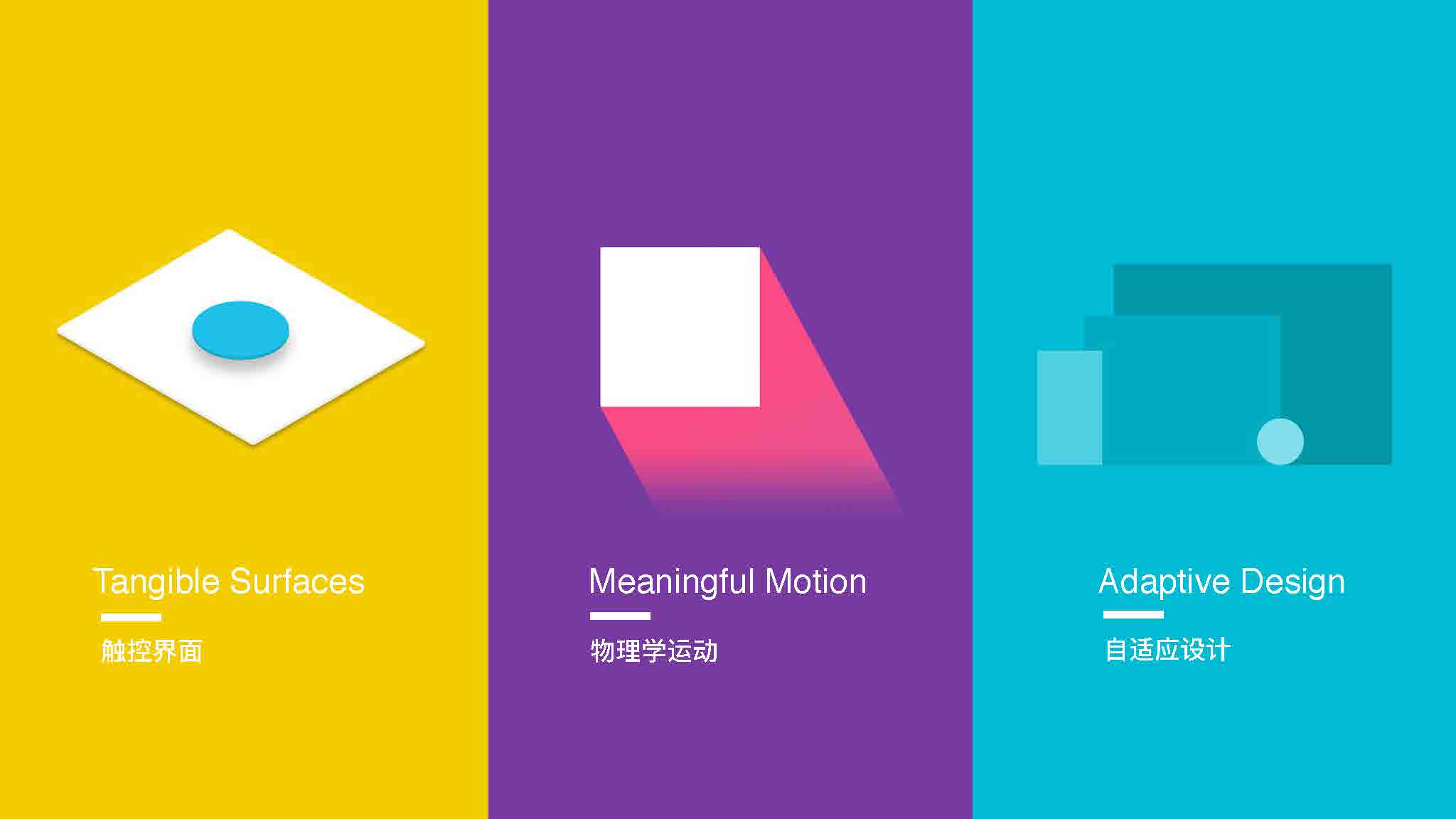 例子一:互联网界应用最广泛的一套设计语言Material Design。当年我在Google也是参与到这套设计语言的设计当中,它主要的核心理念是要在这个二维平面上模仿三维世界当中物体的运动效果。