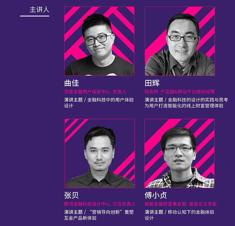 来自蚂蚁金服财富事业群的高级交互专家傅小贞、陆金所产品部&移动平台部总经理田辉、腾讯金融科技设计中心交互负责人张贝、百度金融用户体验中心负责人曲佳,将共同探讨互联网金融产品创新趋势,探究如何通过平衡体验与技术,塑造人性化、服务体验化、连接温度化、资产数据化和生活场景化的金融产品。