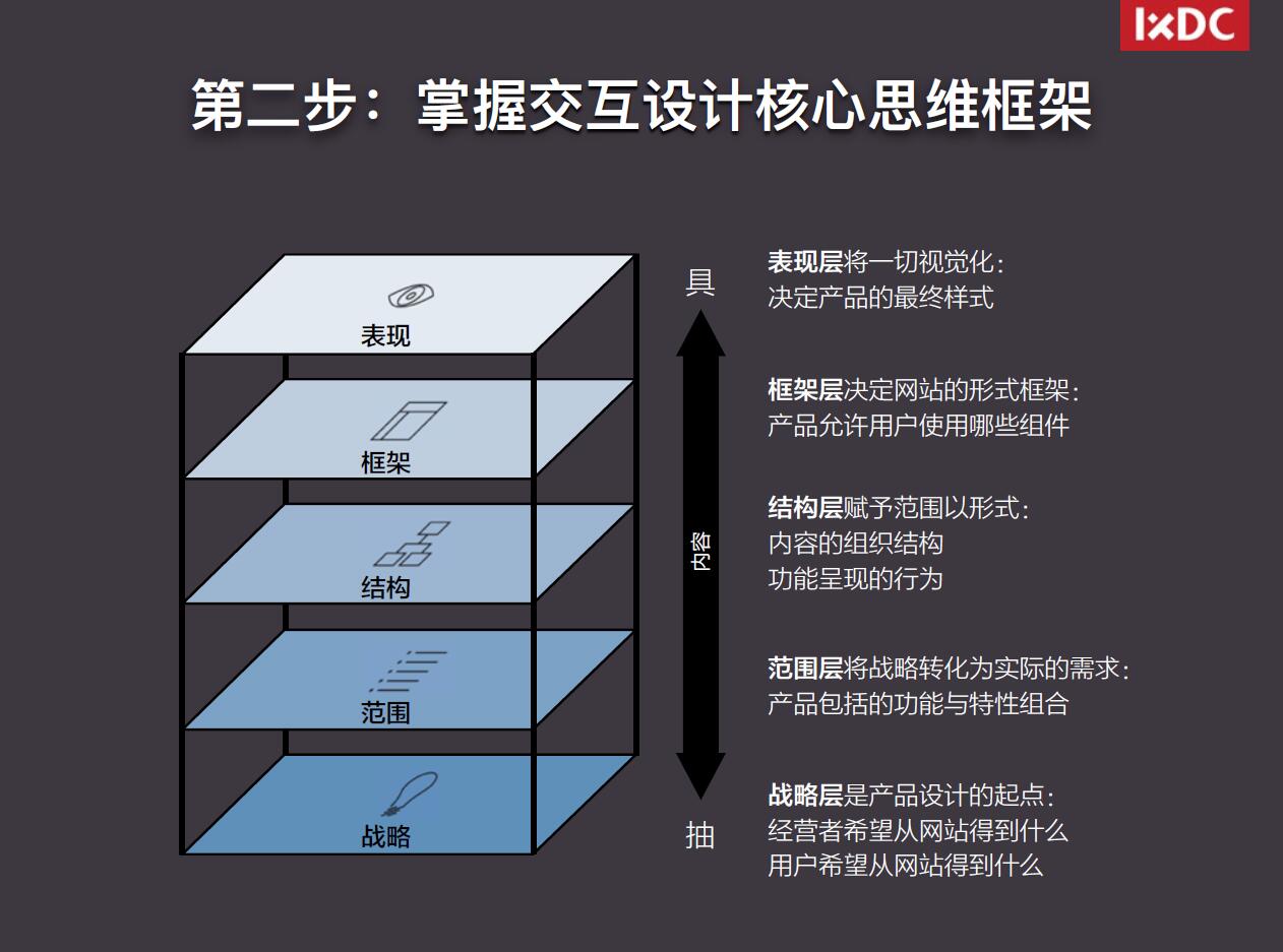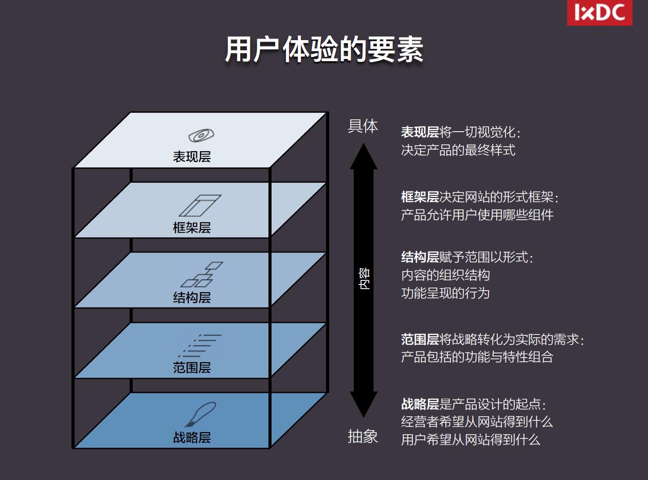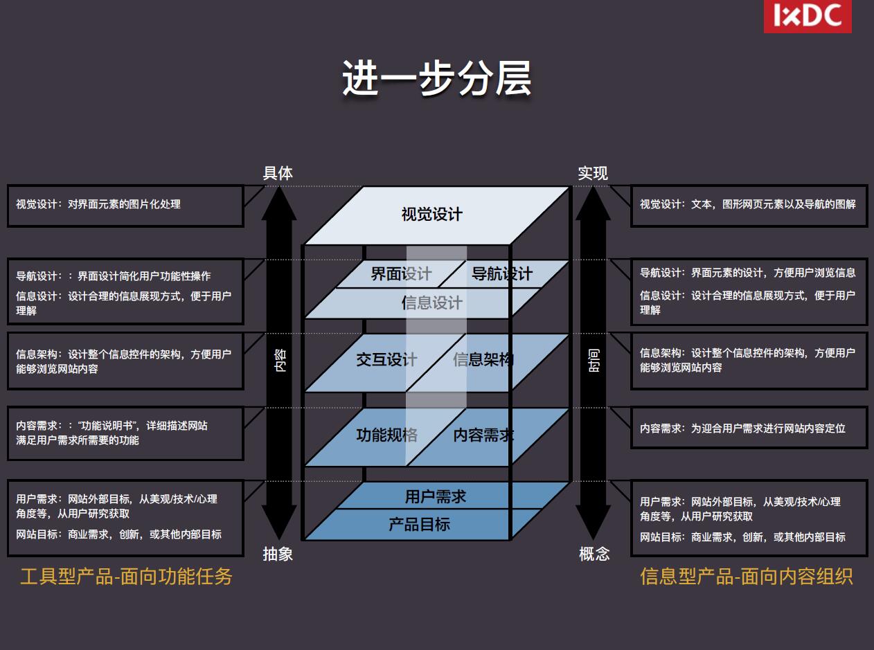 每一层的要素由抽象到具体,层层递进,互相影响。这种由下到上的设计方法是分层渐进式的设计。只有将每层元素处理到位,才能形成全面优质的用户体验。