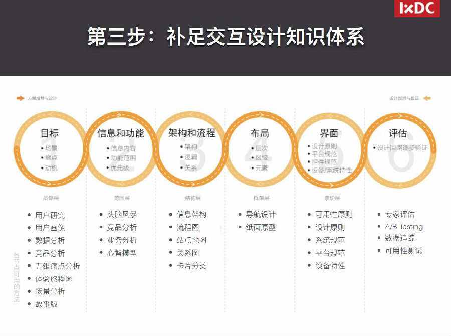 光有思维框架还不行,因为思维的每一步都需要方法去让它落地,这时候就需要补足交互设计的知识体系。比如说战略层,要了解目标,要用到什么方法呢:用户研究、用户画像、数据分析、体验地图等等。你掌握了这些方法,你才能通过梳理出用户的痛点和动机。其他层面也是一样。