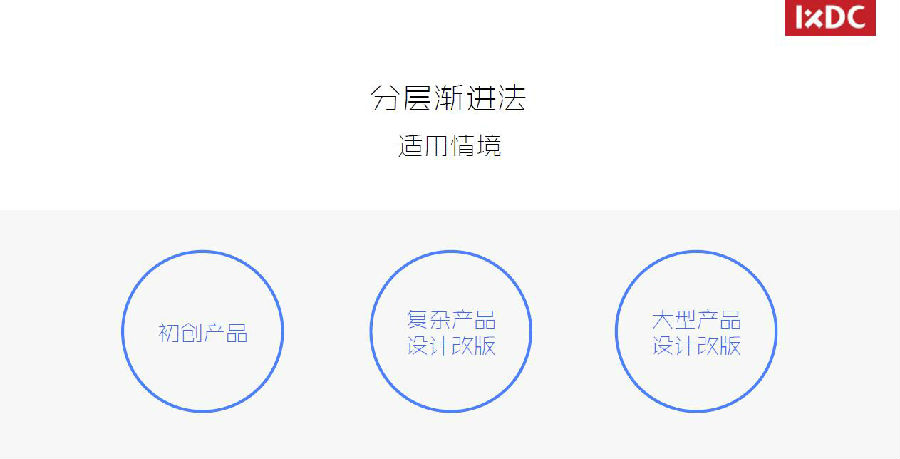 分层渐进法适用于初创产品、复杂产品设计改版以及大型产品设计改版。