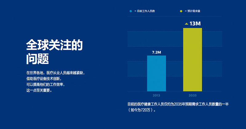 在世界各地,医疗资源越来越紧缺,这是全球性的难题。人口数量增加及老龄化趋势的发展,慢性疾病的增长,以及全球性医疗资源的短缺,世界各地的医疗系统正承受着巨大压力。同时,越来越多的人渴望积极管理自身和家人的健康。借助医疗设备技术创新,提高医疗诊断的工作效率,推动健康医疗关护向低成本的模式和家庭转移,从而降低成本。而飞利浦则是通过以人为本的创新医疗解决方案,满足各地患者和医护人员的需求,直接改善人们的生活质量。