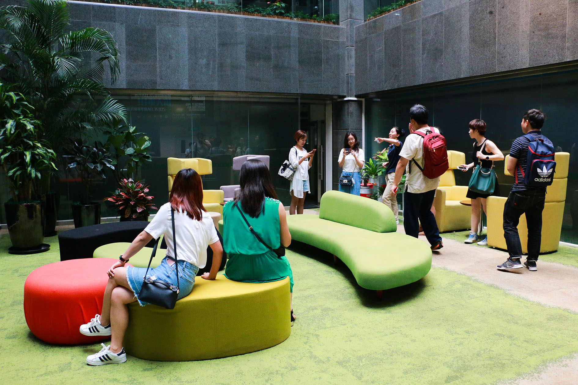 随后,大家前往办公区域。路上可以看到墙角五颜六色的主题QQ模型,大家纷纷赞叹腾讯在细微处体现出的企业文化。