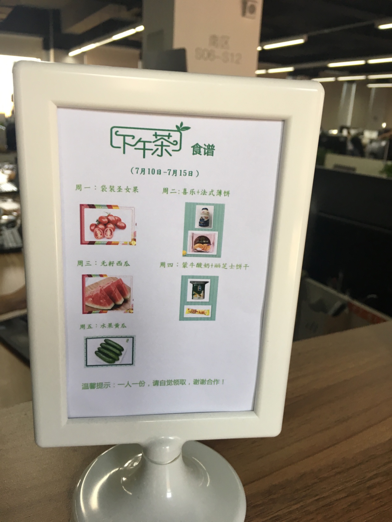 在参观办公区域时,我们还发现了许多温馨的小细节,譬如随处可见的U形枕头,员工在电脑前工作久坐,感到疲惫时,可以自行拿走休息;还有一周下午茶菜单,员工每天都有不同的、丰富的下午茶点心可以享用。