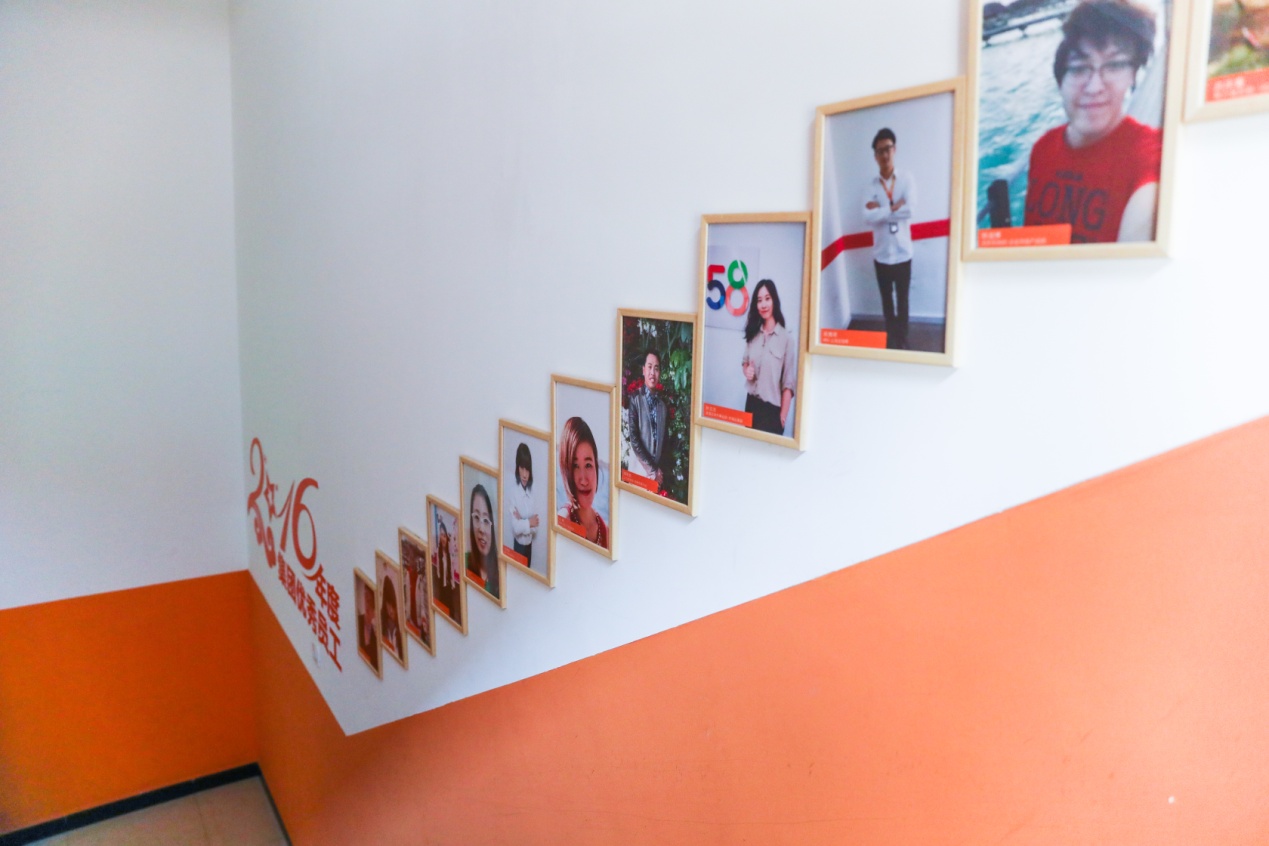 我们还发现了58公司非常有的特色的一片区域——优秀员工公示墙。公示墙被安排在了楼梯间,员工照片随着上升的阶梯一同往上悬挂,象征着天天向上,力求更好的员工精神。同时,每个员工温暖的笑脸伴随着步行上楼的同事,也是一种凝聚力的象征。
