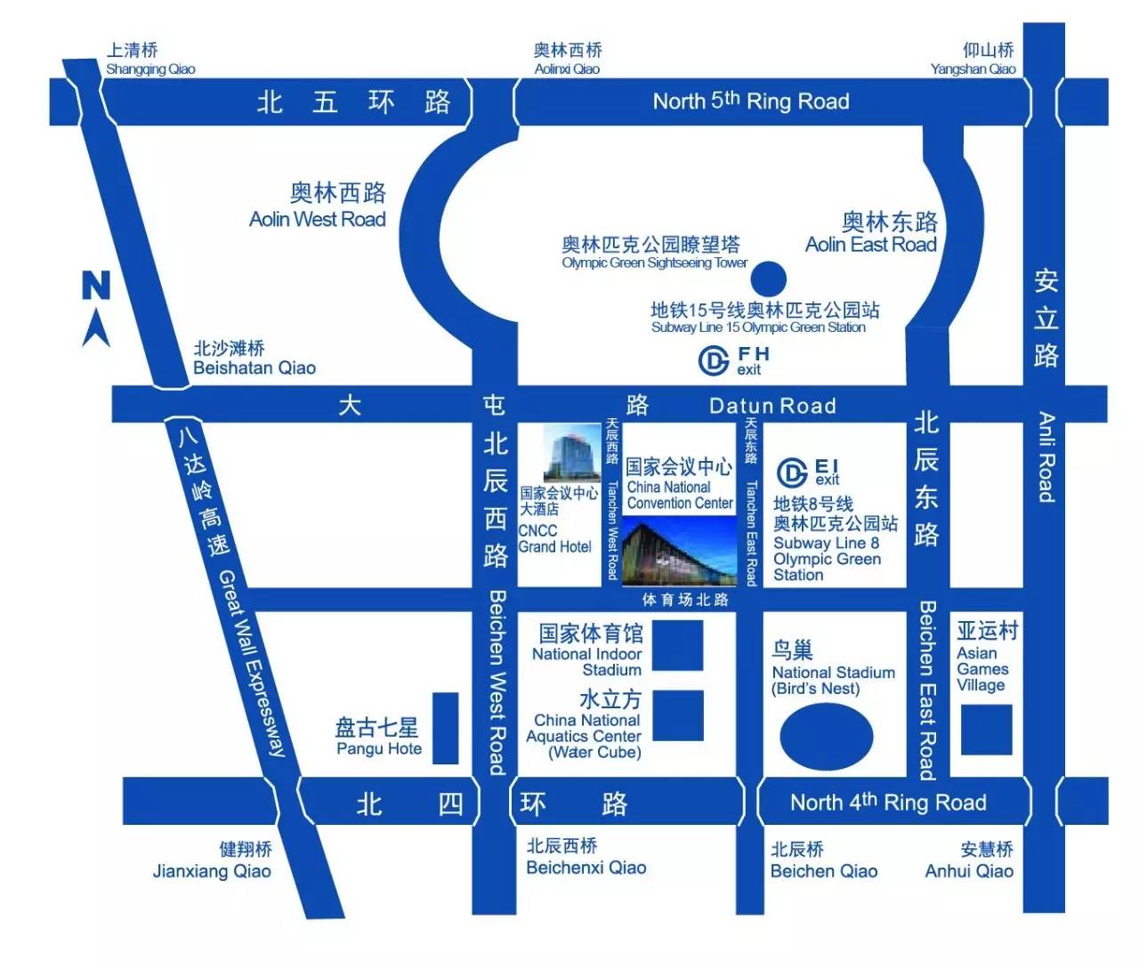 地铁路线规划: 8号线,奥林匹克公园站下车,从E出口出,步行450米,约6分钟即到会场