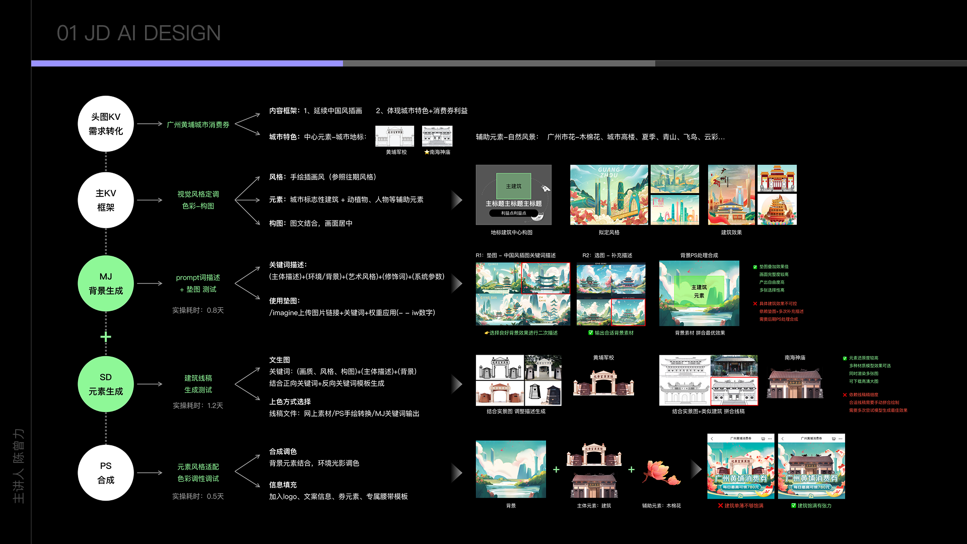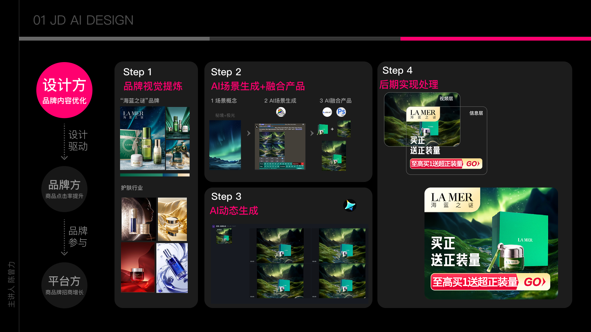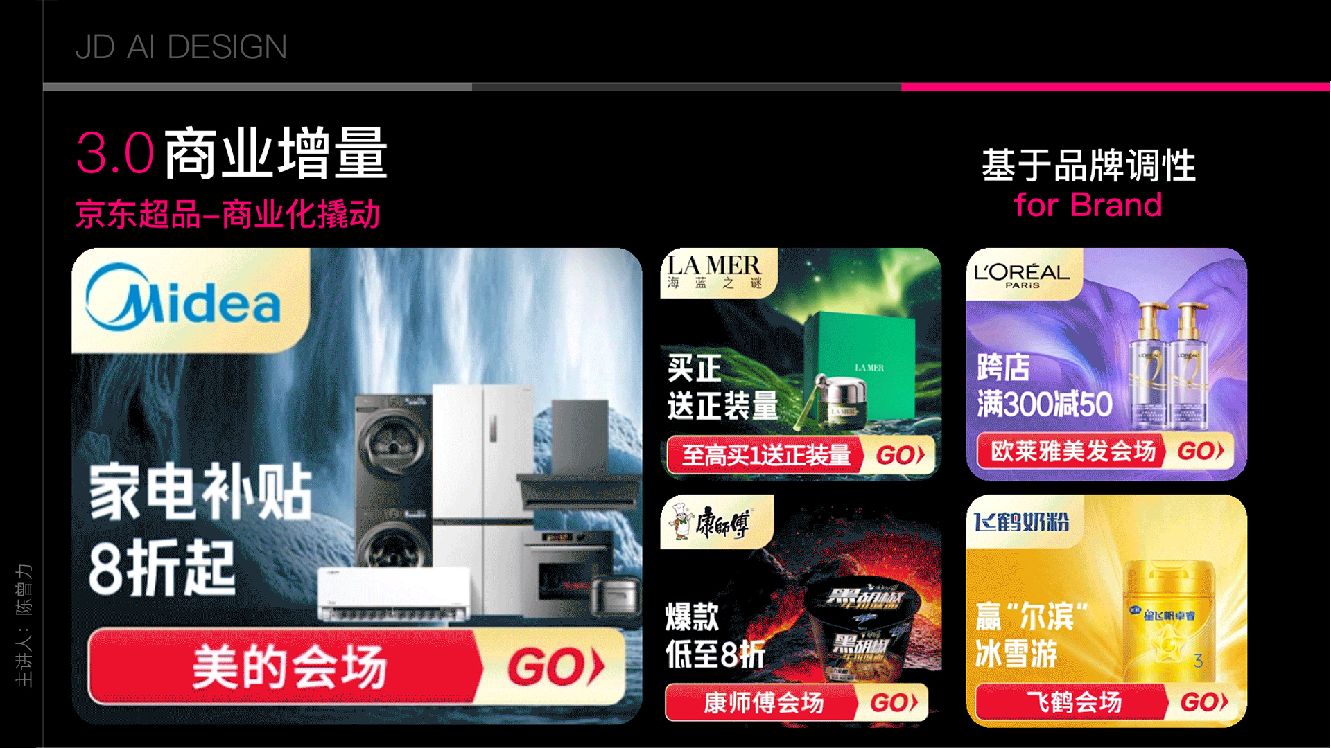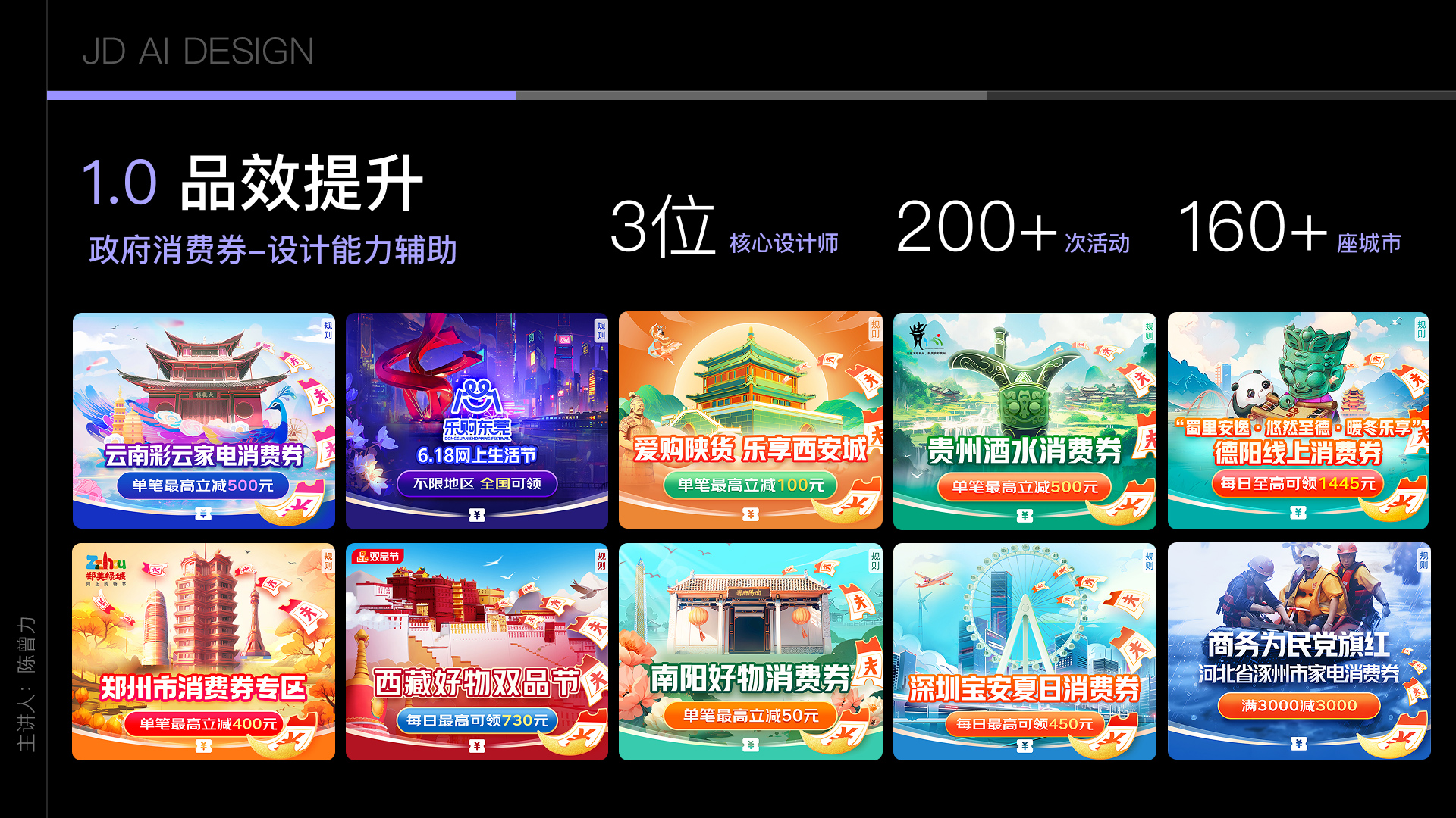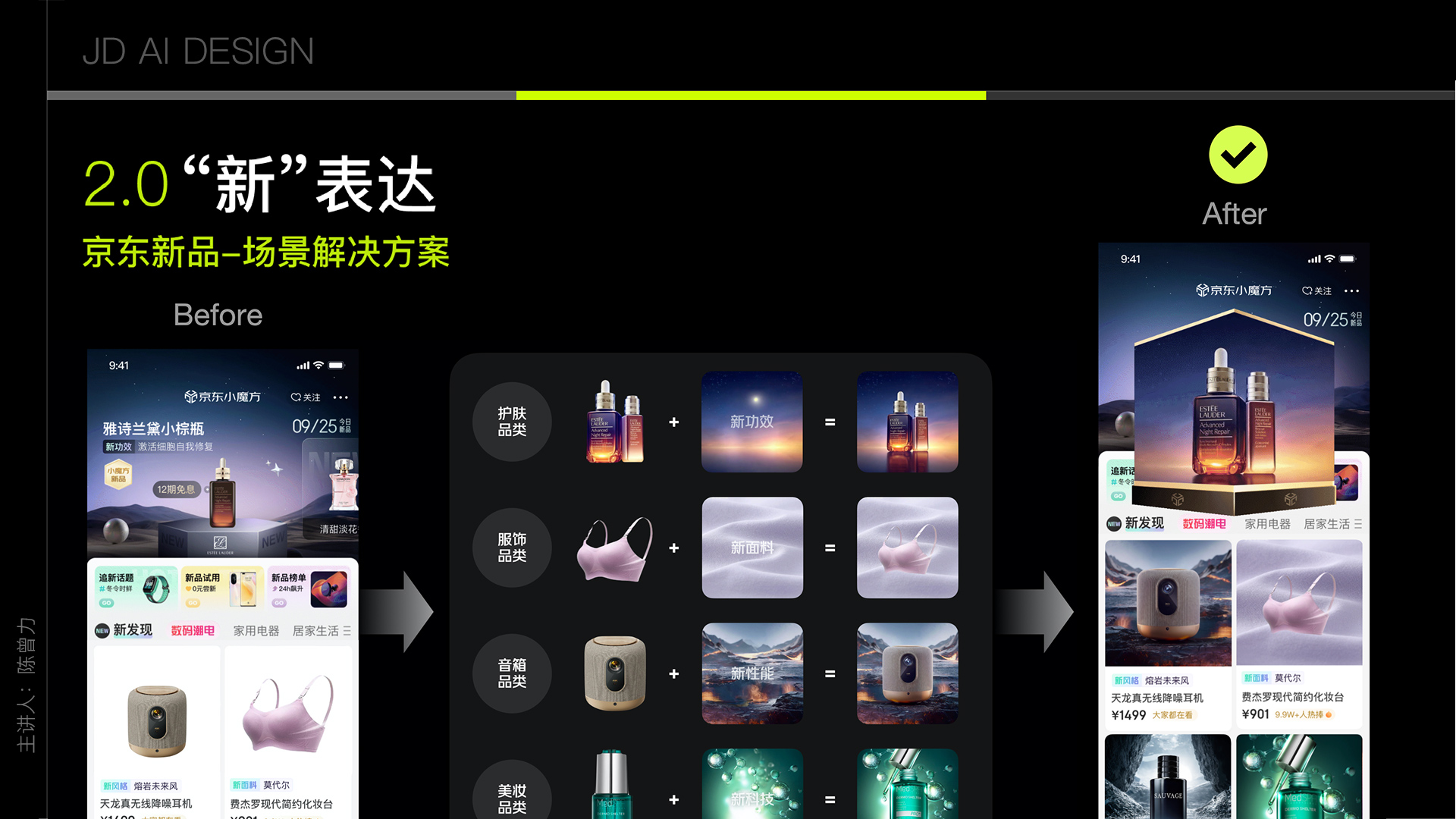 本次工作坊将围绕AI时代下,如何通过人机协同重塑体验策略与商业增量进行系统阐述,聚焦角色、问题、方案与生态四大层面。其中,会以三个阶段性AI实践出发:1.0 政府消费券-品效协同设计、2.0 京东新品-“新”的感知表达体系构建、3.0 京东超品-“大牌感”视觉系统的策略转译,拆解在真实业务挑战中,我们如何以设计思维为框架,AI能力为引擎,从问题识别、技术试跑、表达调优、效果验证到标准化工作流构建,形成一个具备批量生产力与高质量审美并存的人机协同设计策略。