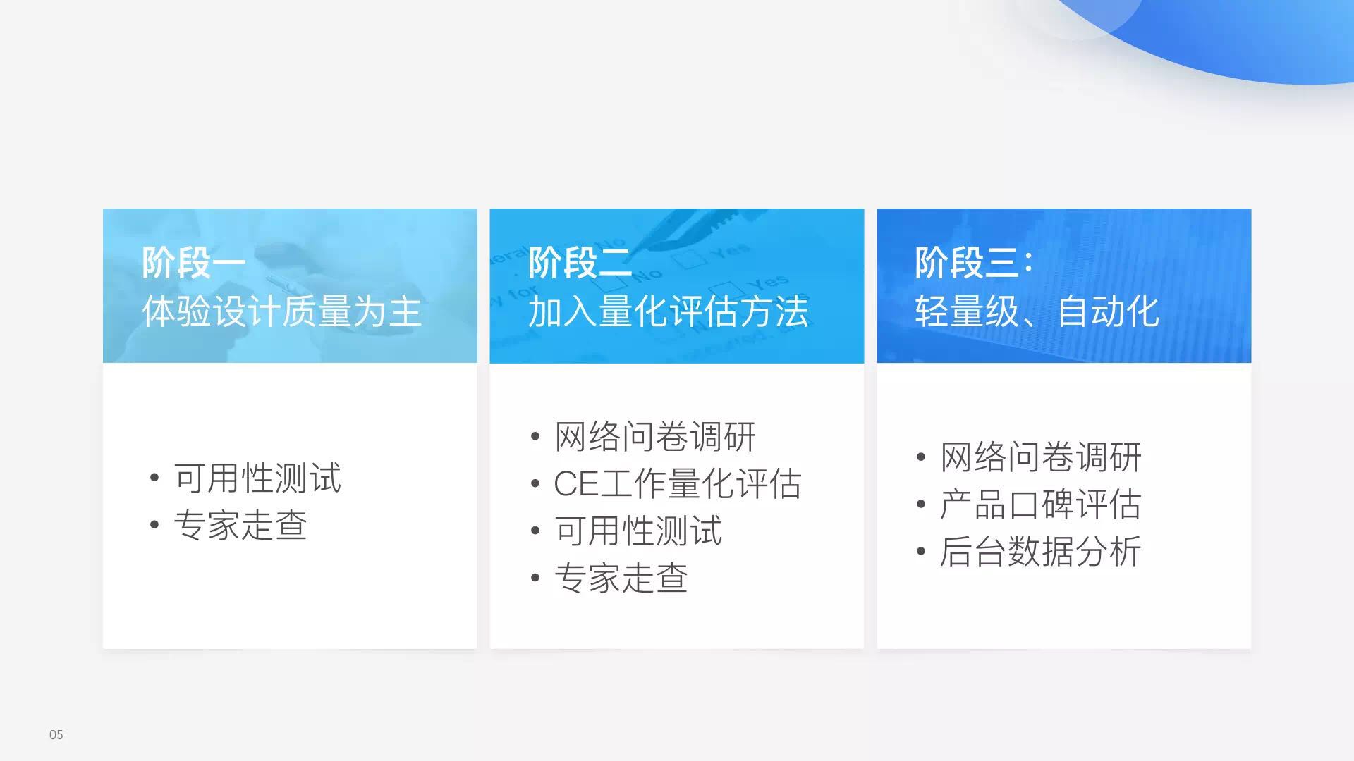 在2007年,我们开始帮助公司重点产品,通过体验测评的办法来做年度的体检。最开始是考评体验设计质量为主,到后来加入量化的评估方法,经过10年的方法提升,有了工具和平台的帮忙,现在能更自动和轻量级的完成产品的年度体检。