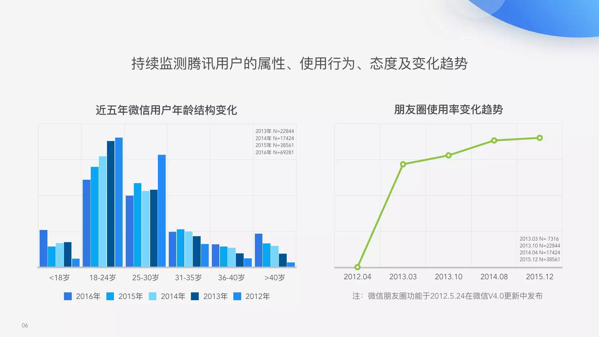 我们看到最近五年,微信用户往高龄和低龄两端发展,产品会关注目前的设计是否适应新用户群体的需求。下面这张图看到,我们在微博还盛行的时候发布了朋友圈,当时褒贬不一,甚至还有业内人士预言朋友圈失败,用户画像研究一路见证了朋友圈的成长与变化。