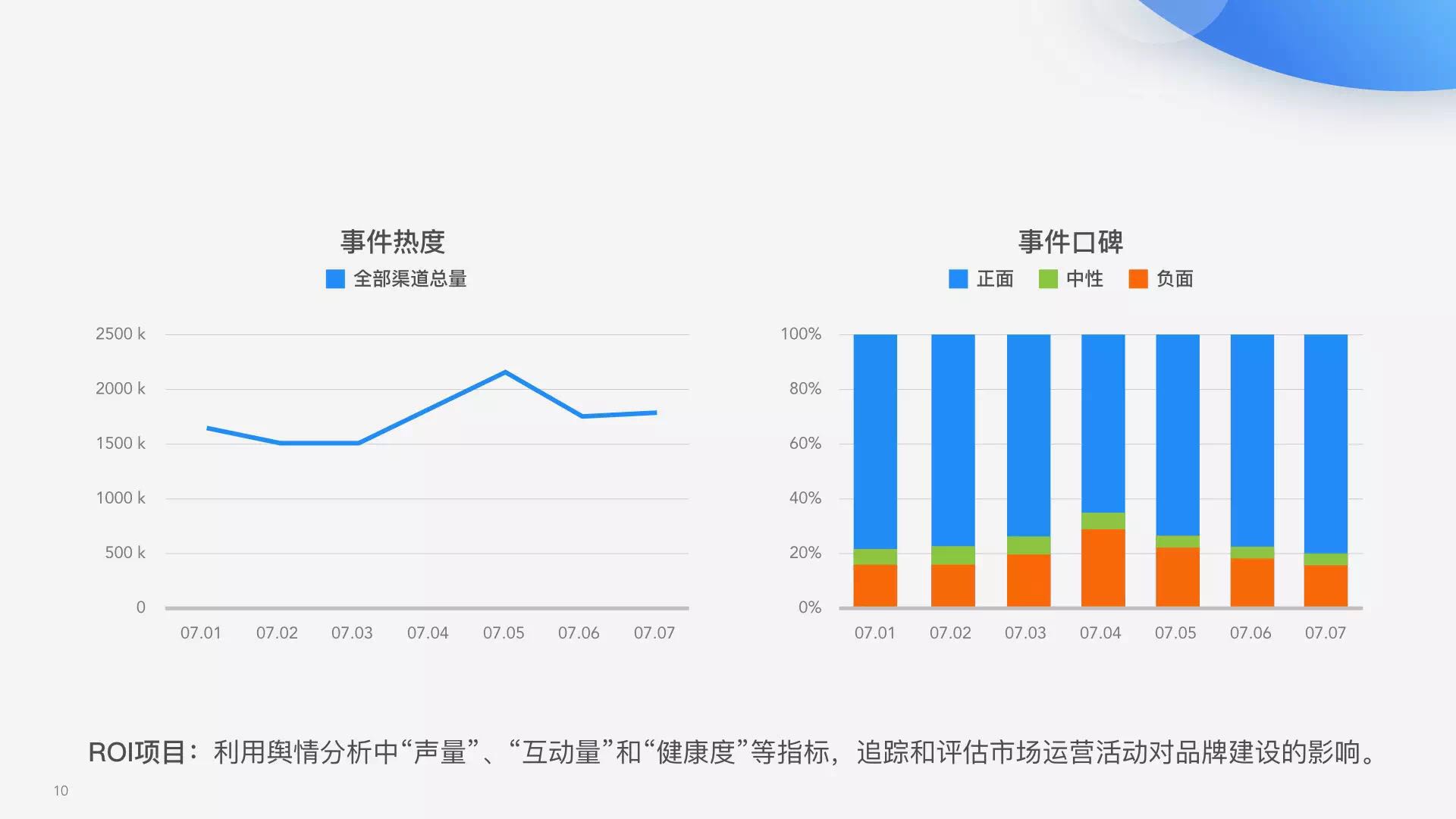 除了研发以外,公司每年都会有大量的资源投入在市场运营上,而这些市场运营活动对品牌建设最终能起到什么作用,需要有科学的方法去评估,才能判断投入是否都值得。因此我们在市场营销的ROI研究中,利用舆情分析中的声量,互动量和健康度等指标,追踪和评估市场运营活动对品牌建设的影响。