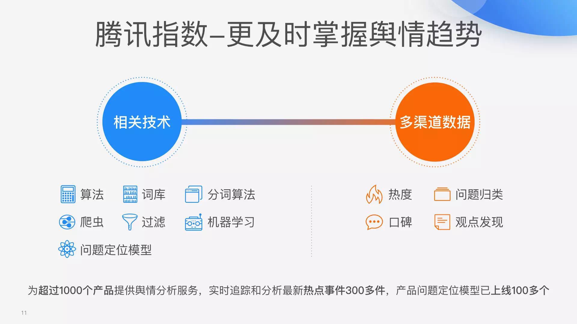 腾讯指数,就是这个项目中催生出来的一个内部产品,通过爬虫,过滤算法,分词算法,词库,问题定位模型,机器学习等相关技术,通过多渠道的数据分析,提供热度,口碑,问题归类,观点发现等自动化等分析功能。