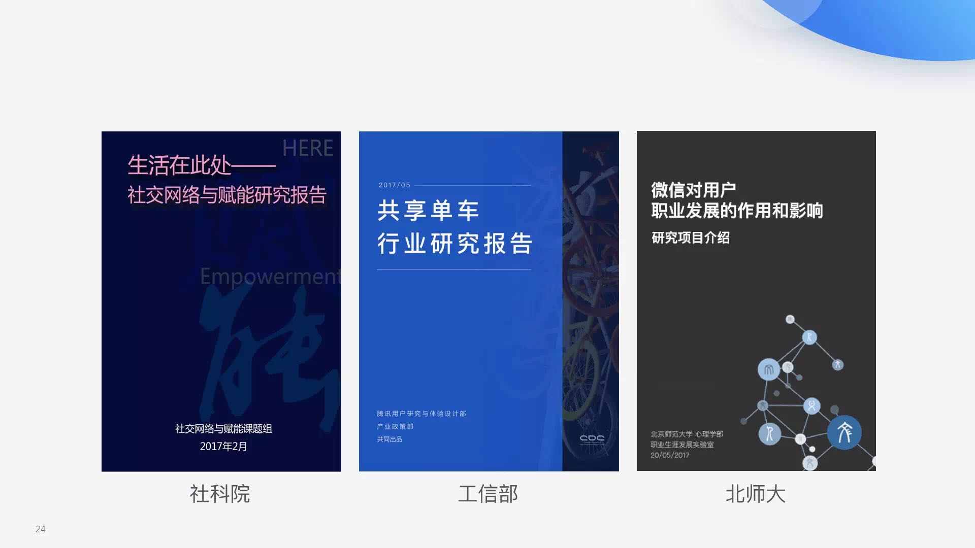我们联合公司的产业政策部、腾讯研究院等部门与社会的一些政府机构和高校进行研究合作,2月帮助社科院完成《社交网络与赋能研究》的调研。2017年5月为工信部输出《共享单车行业研究》报告,最近启动与北师大的合作,尝试研究微信对用户职业发展的作用和影响。