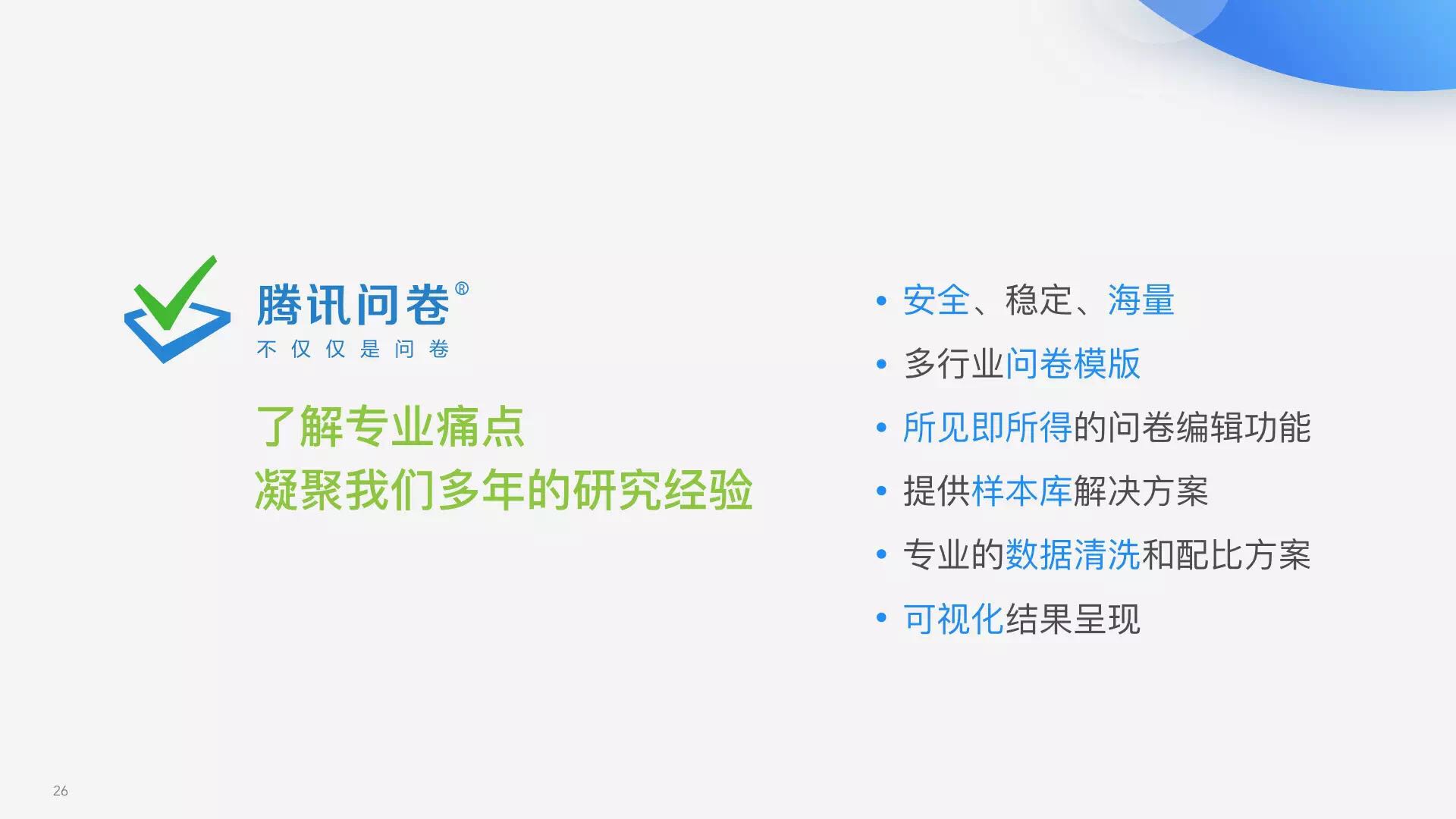 除了以上方法培训和项目合作外,我们还为行业提供了用户研究解决方案的一些工具平台,如腾讯问卷和吐个槽,两个平台都是我们经过多年用研经验的沉淀,结合行业需求精心打造的用户态度调查和意见反馈的重要工具,目前都已经对外使用了,其中腾讯问卷已超150万用户使用。