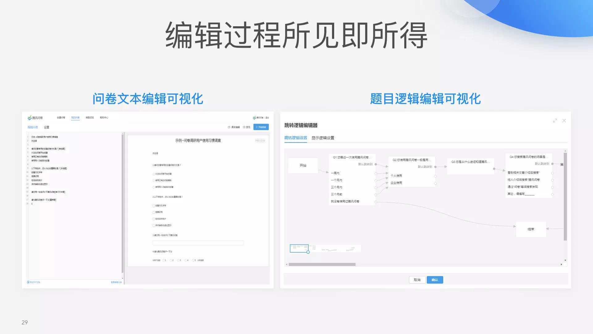 实战效率也是研究工作的一大痛点,经过内部多年的积累和优化,腾讯问卷提供的文本和题目逻辑编辑都实现了所见即所得的可视化效果,问卷文本编辑器在左侧编辑栏输入、编辑、修改问题的同时,右侧预览页可实时查看问卷最终效果,从而快速、高效地完成问卷编辑工作。而题目跳转逻辑的编辑,则用类流程图形式通过拖、拉、连的方式实现题目间跳转逻辑的关系设置,操作更简单、显示更清晰。