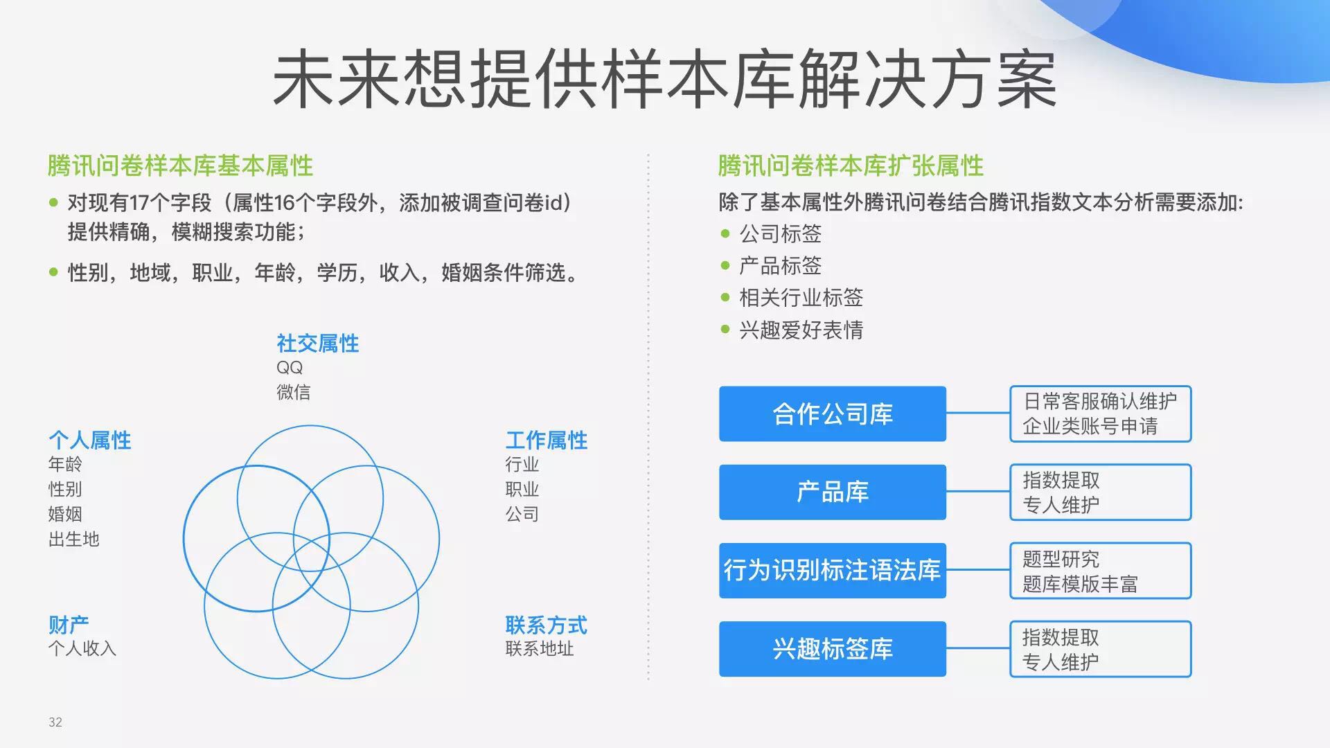 此外,腾讯问卷即将推出样本库服务,目前已建立了社交、个人、工作、财产、联系方式5大维度的基础样本属性库,后期还会搭建产品、行为、兴趣等扩展属性库。我们将通过问卷标签、自然语言处理、文本挖掘等技术不断丰富完善的样本库资源,力求解决问卷精准投放的最后一公里问题,有效提升问卷投放回收效率,希望为行业提供全面丰富的问卷样本库解决方案。