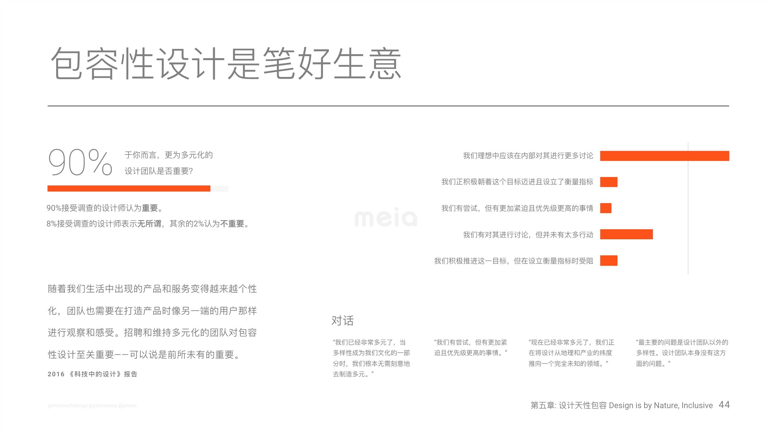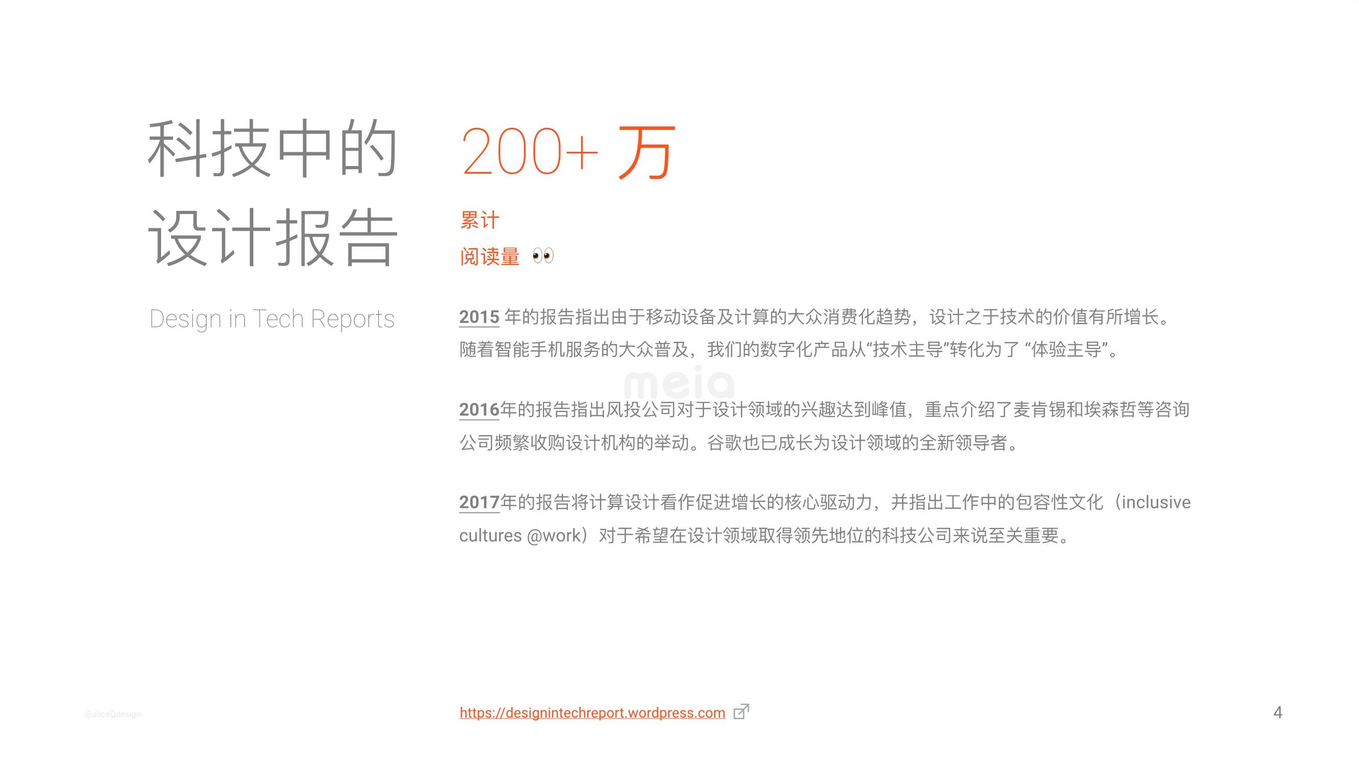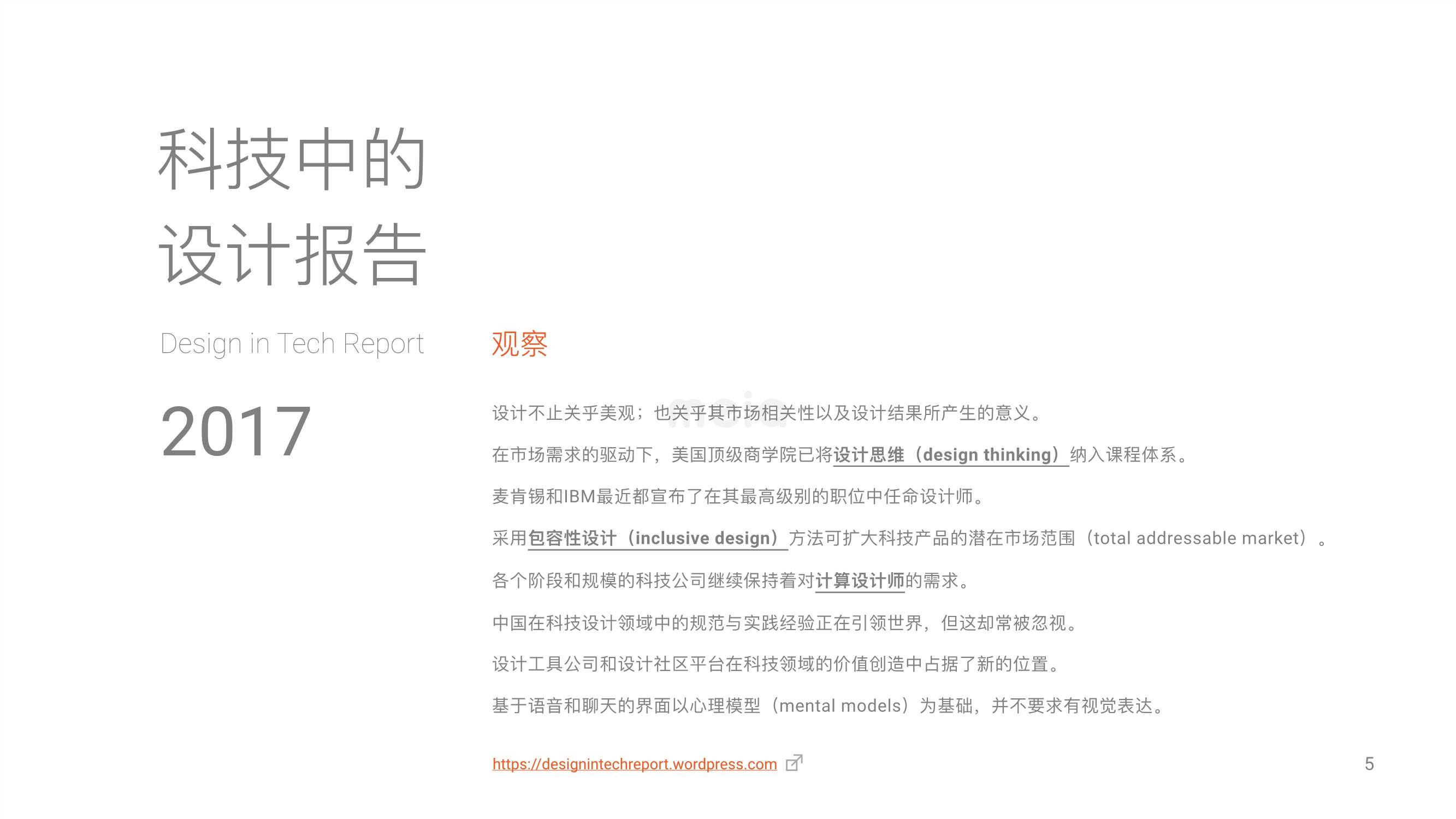 2017年3月11日《科技中的设计报告2017》英文版重磅发布,这份长达49页的PPT总结了中美各国以及其他地区的互联网、科技、设计发展趋势,以大量真实案例和大数据分析佐证分析并指出:2017 的报告将计算设计看作促进增长的核心驱动力 ,并指出工作中的包容性文化(inclusive cultures @work)对于希望在设计领域取得领先地位的科技公司来说至关重要。