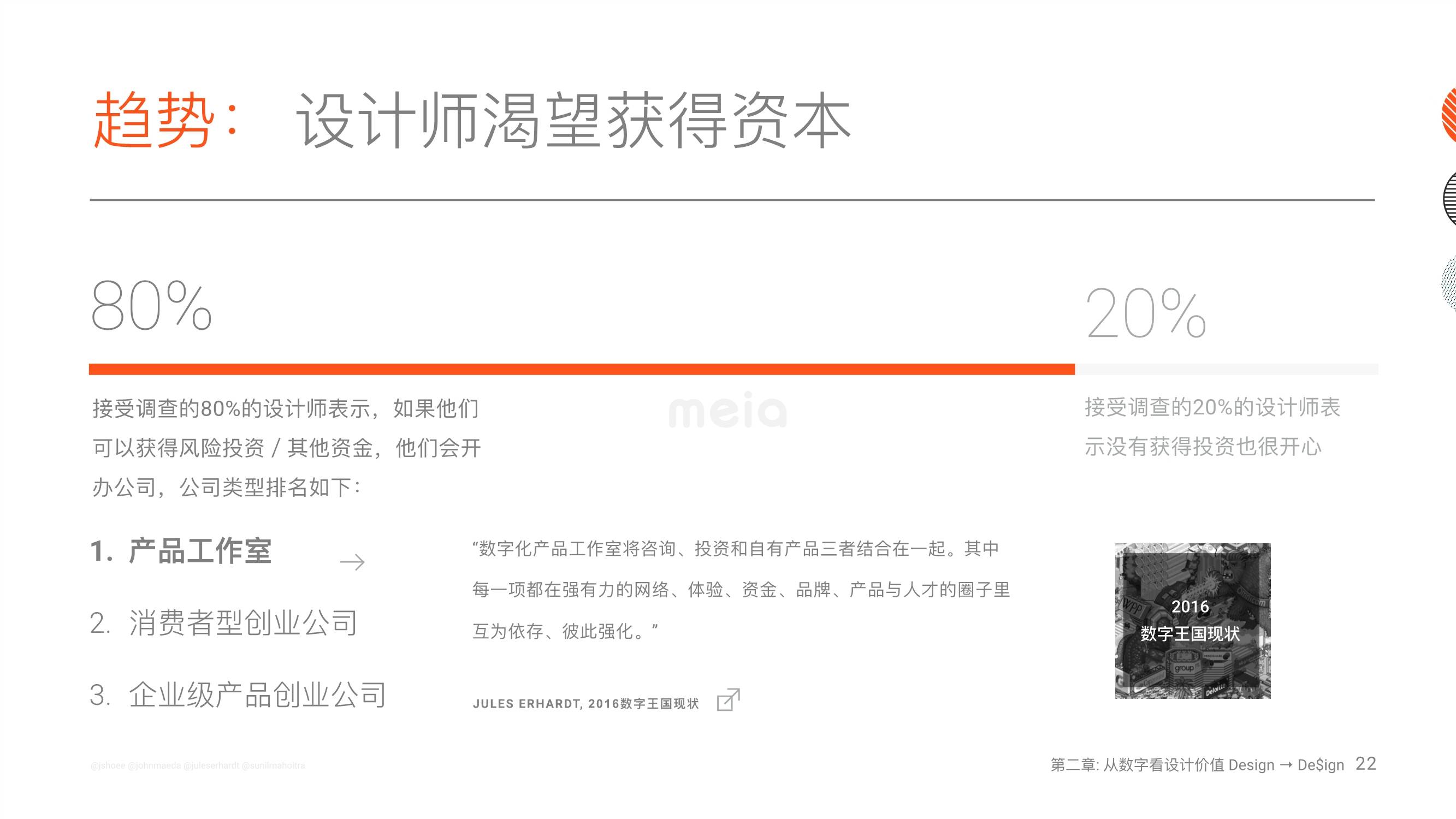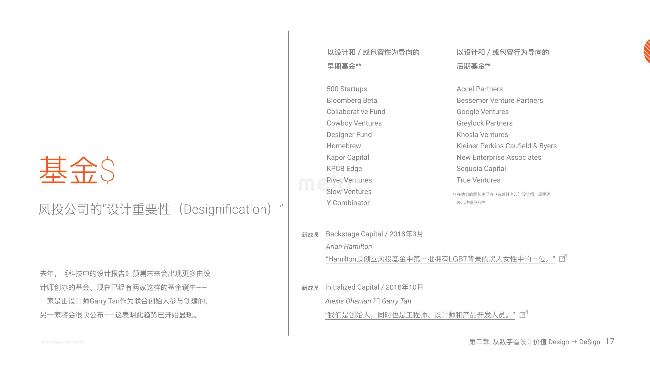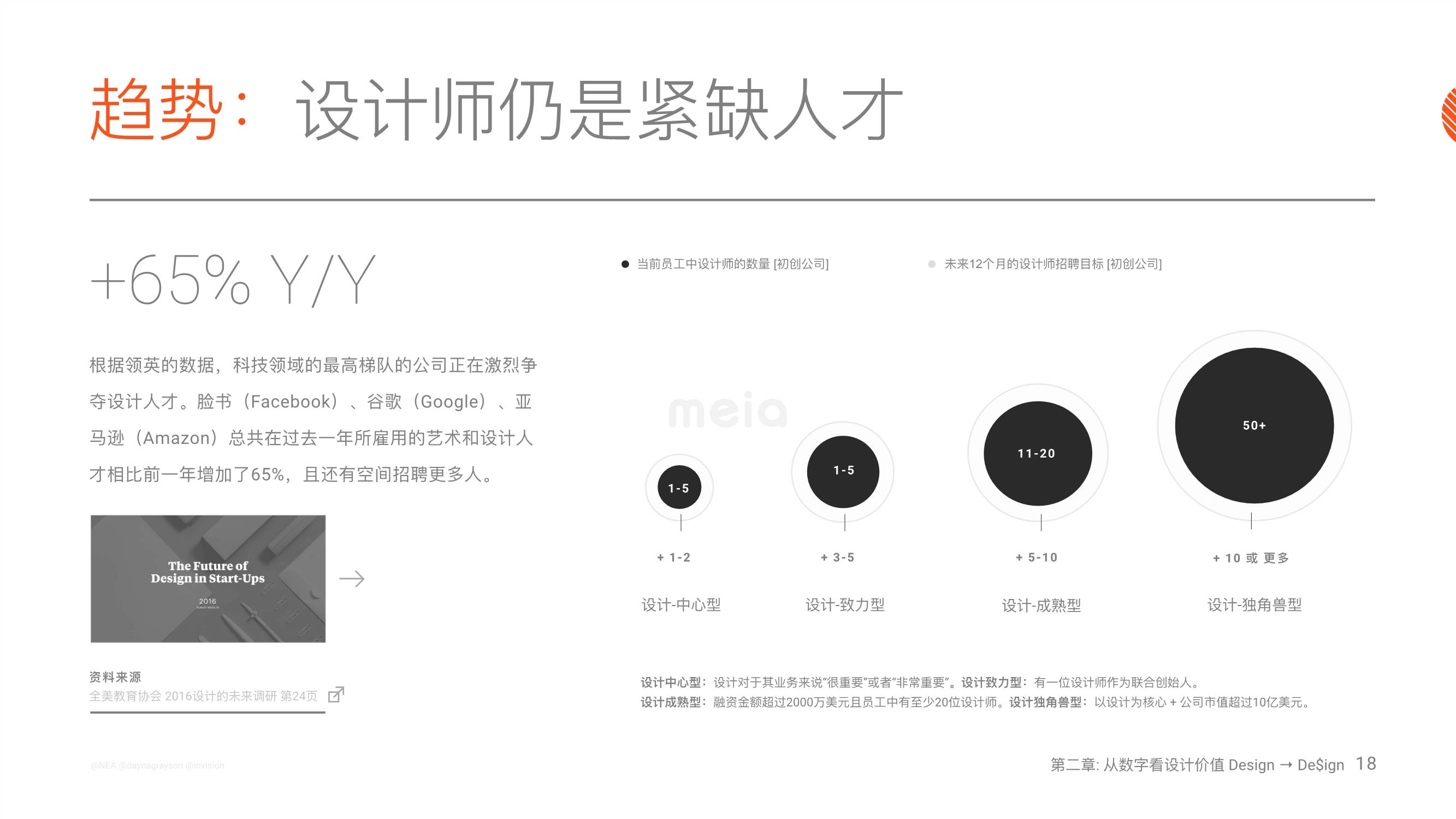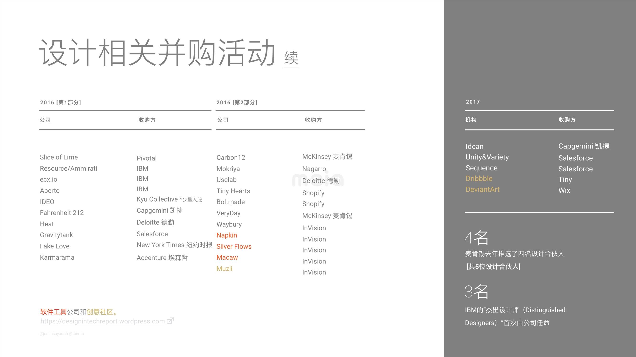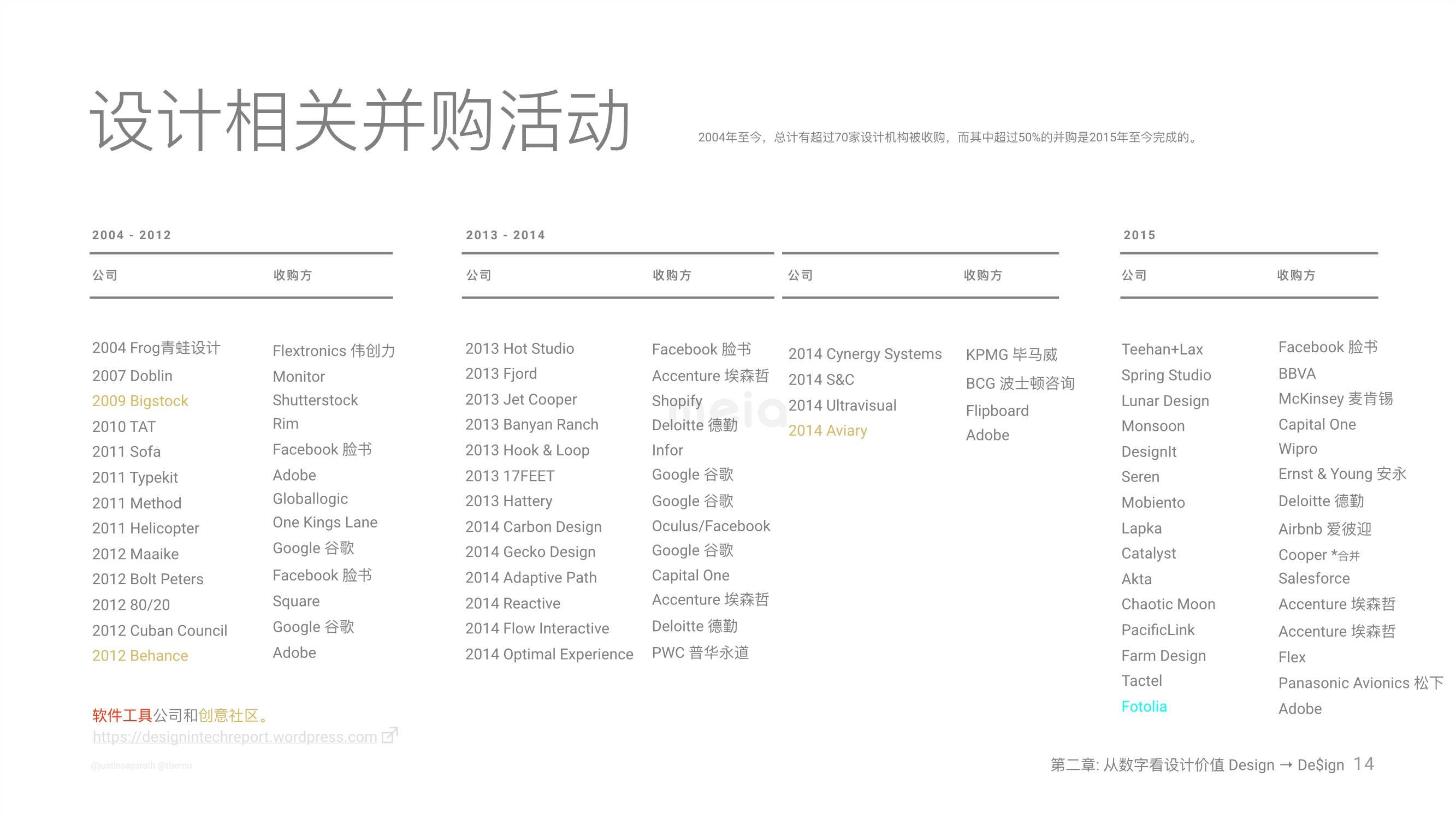 2016 年的报告指出风投公司对于设计领域的兴趣达到峰值,重点介绍了麦肯锡和埃森哲等咨询公司频繁收购设计机构的举动。⾕歌也已成长为设计领域的全新领导者。